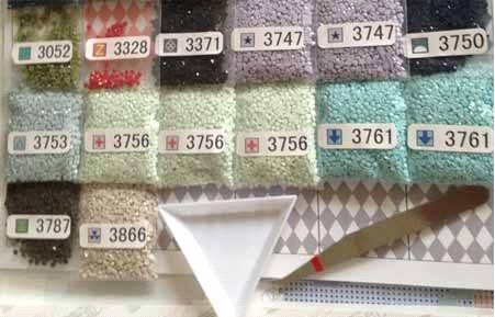 3. В таблице найдите номер, соответствующий символу на схеме. Из пакетика с этим номером отсыпьте в поддон немного деталей - алмазиков.