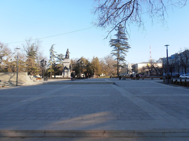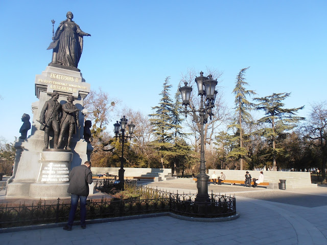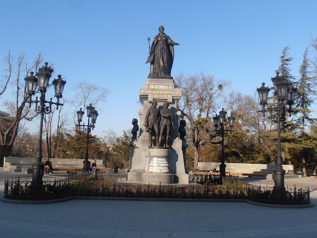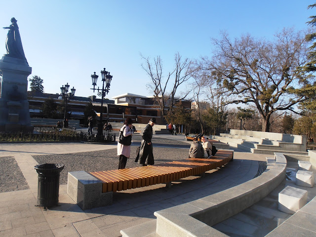 У пямятника Екатерине все на высшем уровне - новая плитка, работающие фонари, целые лавочки, фонтаны. И будка охранников из самообороны (на фото не видно, но она там есть).
