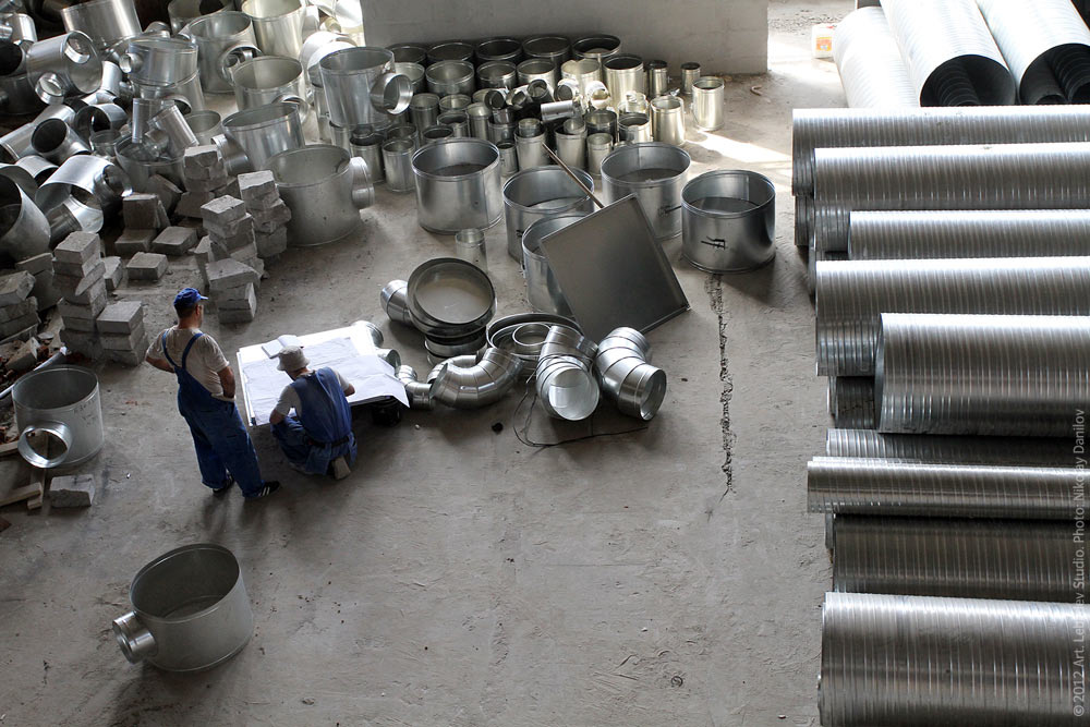 Июнь. Рабочие начинают монтаж воздуховода в новом офисе студии.