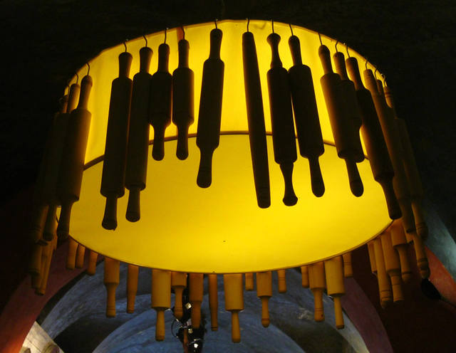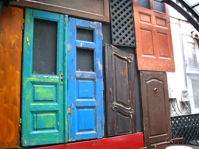 Стены украшены старыми дверьми.