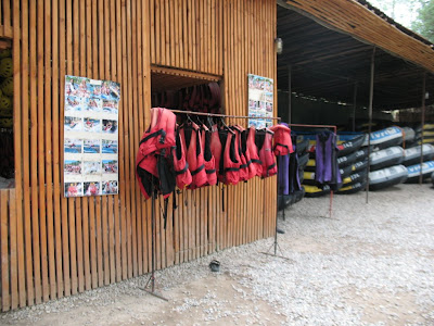 По всему было заметно, что рафтинг в Турции — популярный и успешный бизнес, бизнес во всем. На месте сначала нам показали небольшой видеосюжет о предыдущих сплавах, потом разделили на пользователей рафтов (10 человек) и каяков (2 человека). Очевидно, что большая часть пожелала окунуться в экстрим с головой и выбрала каяки-двойки. Должен сказать, практически всем это удалось — кое-кто опрокинулся на первом же порожке. Жилеты выдавали всем, гидрокостюмы — только желающим, гидротапочки — в аренду. Брать ничего кроме весел и жилетов не советовали, мол — холодно не будет. Но мы по привычке взяли костюмы и снова не прогадали, даже в них было прохладно, а на посиневших людей в плавках на стоянках было больно смотреть. Поэтому они, не задумываясь, хватали горячительную ракию, чего и требовалось хитрым туркам.