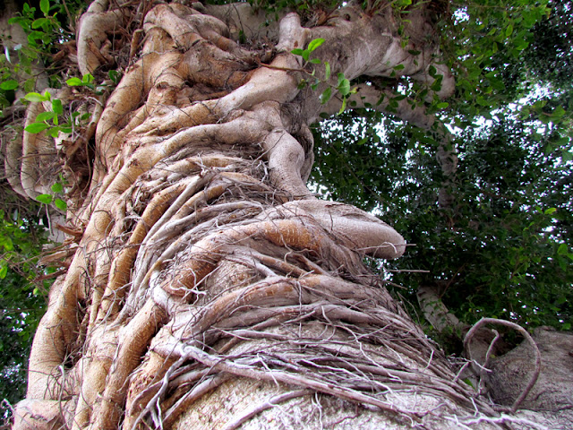 Всё гораздо проще. Эти древесные хитросплетения - воздушные корни фикуса.