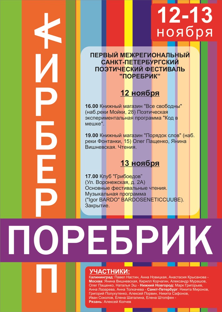 16.00 Книжный магазин «Все свободны» (наб. реки Мойки, 28) Поэтическая экспериментальная программа «Код в мешке».