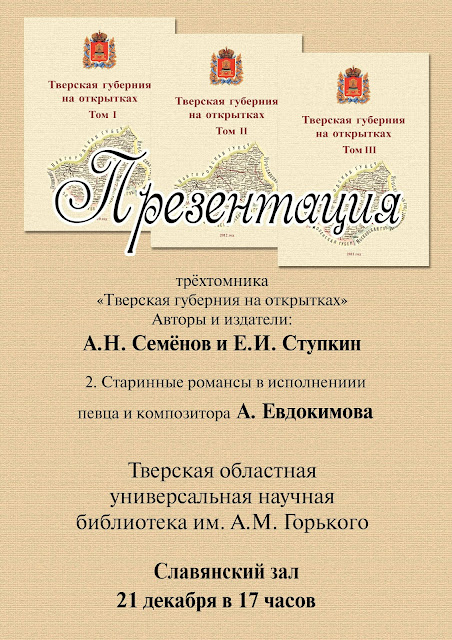 Директор издательства — известный краевед и издатель, меценат и коллекционер Евгений Иванович Ступкин и филокартист, член Редакционного совета журнала «Тверская старина» Александр Николаевич Семенов представили трехтомник «Тверская губерния на открытках» в целом и новый второй том, в который вошли фотографии открыток Твери и четырех уездов Тверской губернии: Тверского, Корчевского, Калязинского и Кашинского.