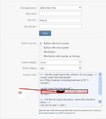 Рис.4 Из это все формы нам необходимо запомнить функцию и ее параметры (в частности ID) VkInit, на рис. 4 обведена красным квадратиком:)) Дальше все аналогично как и в случае с Facebook - между тэгами <head><head/> разместить ниже приведенный код, который инициализирует кнопку Like, и функцию отслеживания, которая будет передававать данные в аналитикс _ga.trackVkontakte();Ее описание есть в файле ga_social_tracking.js