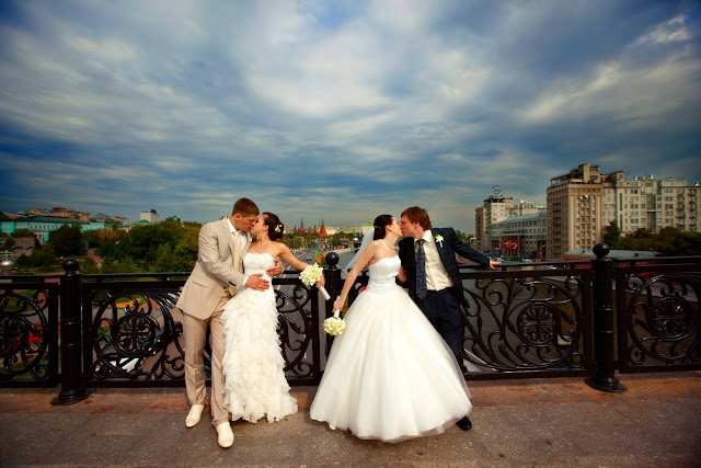 Решение организовать двойную свадьбу первым посетила моего мужа, потом было подробно обсуждено и единогласно принято. И, знаете, я ни на минуту, ни тогда, ни сейчас не жалею, что мы это сделали. Все же свадьба, в традиционном понимании этого слова, - это вовсе не праздник для двоих. Это скорее спектакль, где бедные молодожены стоят на сцене и чувствуют себя неуютно. Сделав двойную свадьбы мы на сто процентов этого избежали. У нас был свой междусобойчик, поделенный на четверых, нам было невероятно весело и классно, а гости были лишь элементом нашего праздника.